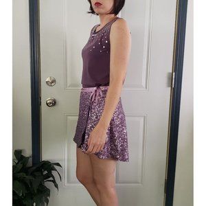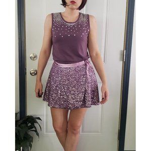 Includes a sequin covered skirt, a tank top, a wrap top, and capri sweats.