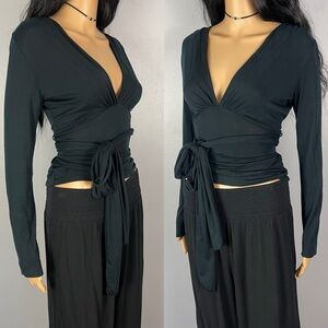 Soft and stretchy black wrap style blouse with extra long ties that wraps several times around the waist. Can be tied in back or front depending on your preference. This item has been gently worn, washed and does not have tags.