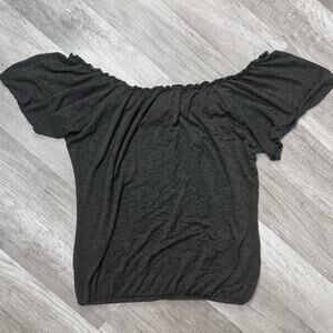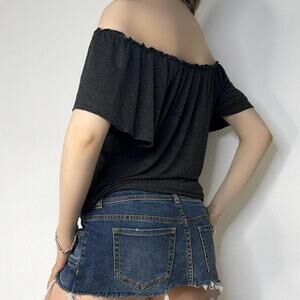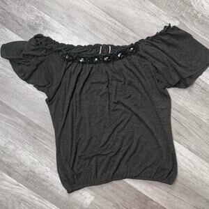 Charcoal off-the-shoulder top with short sleeves and jewels at neckline. Perfect for grunge, coquette, or romantic vibes. Great Y2K piece to pair with low rise jeans or a mini skirt for a femme edgy look