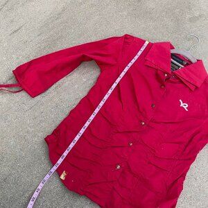• vtg red button down w curses ruching around waist & quarter sleeves w ties