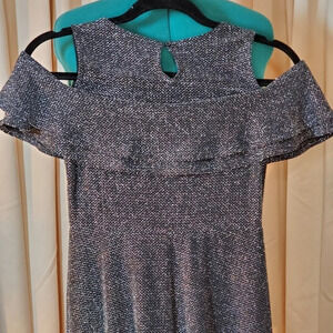 EUC ~ Packable, cute, sparkly, open shoulder, wash & wear, fancy dress! Bust: 30" ~ Waist: 26" ~ Hip: 40" ~ Shoulder to Waist: 13.5" ~ Shoulder to Hem: 30" ~ It features a double ruffle around the shoulders, there is no tag.