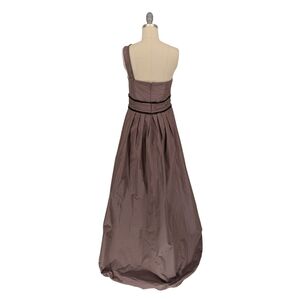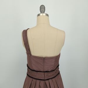 This elegant brown one-shoulder dress features a unique design with intricate detailing. Perfect for special occasions, it offers a sophisticated look.