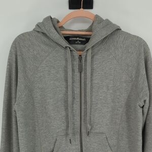 Soft heather gray hoodie with zip closure. Features front pockets and drawstring hood.