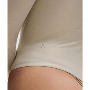 This is a NWT Lululemon Wundermost Ultra-Soft Nulu Square-Neck Long-Sleeve Bodysuit in the Shine Luxe Shine Foil Print and Bone color.