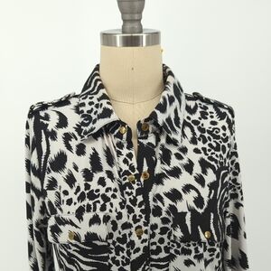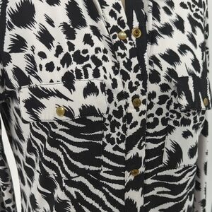 Stylish button down shirt with a bold black and white animal print. Features gold button accents.
