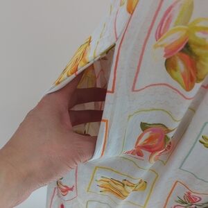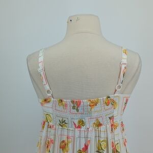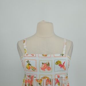 Charming sundress with a vibrant fruit print. Features a mix of orange, pink, and green hues.