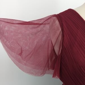 This elegant burgundy dress features a flattering V-neck and delicate sheer sleeves. Perfect for any occasion, it combines style and comfort effortlessly.