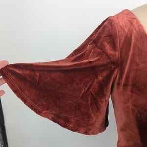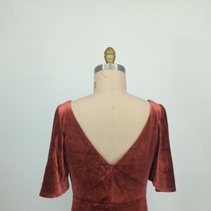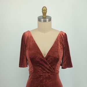 This elegant velvet wrap dress features a rich rust color, perfect for any occasion. The soft fabric and flattering design make it a must-have addition to your wardrobe.