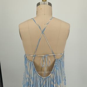 v neck, open back, flowy, tiered skirt, lined . Stylish blue and white striped dress. Perfect for casual outings.