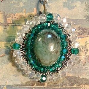 Artisan Handcrafted Large Brazilian Blue-Green Emerald Pendant, Encircled with Blue-Green and Clear Swarovski Crystals.
