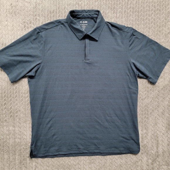 01.Algo Mens Performance Polo Size 2XL Blue Striped Short Sleeve Quick Dry Golf. Condition is Pre-owned. Still in really good shape. No rips, stains or tears. Take a look at the pictures (zoom in) and measurements please. Thanks for looking. Enjoy the rest of your day. Shipped with USPS First Class