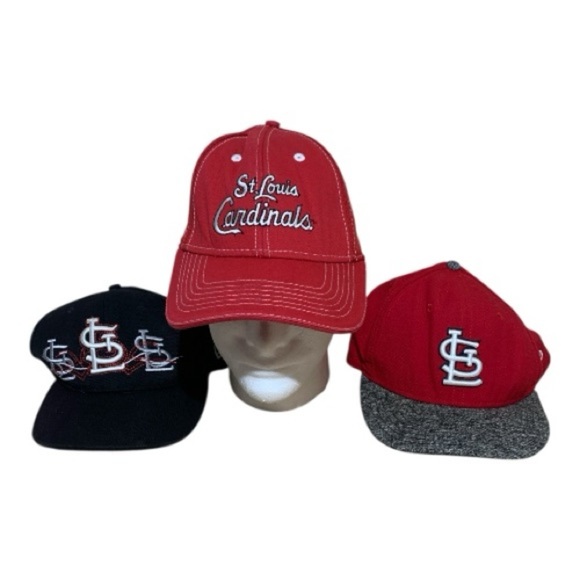 Set of three St. Louis Cardinals baseball caps. Features red and black colors with team logo. Bundle includes the following: