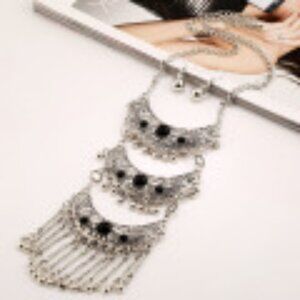 #021 Hollow Gemstone Necklace Vintage Tassel Chain with Earrings