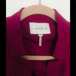 Sandro Fuchsia Pink blazer. New without tags but it’s a little wrinkly from being in closet. Slight shoulder padding. Hook front closer. Size 40. US size 8-10. Pit to pit 18.5 inches wide. 24 long in front. 22 inches long in back. Sleeve 24 inches long.