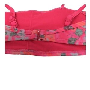 Justice ruffle pink& silver sparkly bikini Swimsuit top has three tiers of ruffles mock tie dye look with sparkly silver splashes all over top and bottom hook and clasp in back adjustable straps embroidered heart on the back of bikini bottoms size 12 Nwot