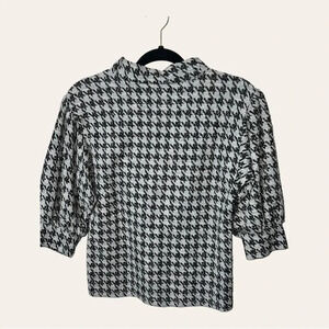 DETAILS: HOUND TOOTH PATTERN; HALF SLEEVE PUFFY SLEEVE; MOCK NECKLINE