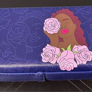 Stylish clutch with artistic design. Features blue background with pink and brown artwork.