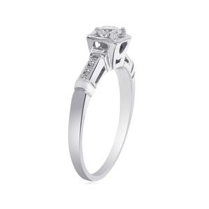 This stunning vintage diamond engagement ring in 14K White gold is perfectly set with a stunning 0.20 carat (total carat weight) round cut center diamond, with color/clarity I/VS2 in a prong setting. On the side of the center stone are six more round cut diamonds 0.10 Ct. tw. color/clarity I-VS2 in a channel setting. Engagement ring weighs 2.5 grams, width 5 mm and size 5.75. For re-sizing information for this diamond engagement ring, please contact us.