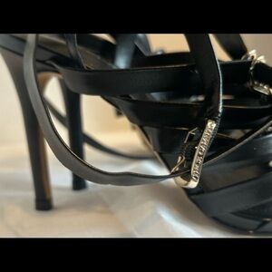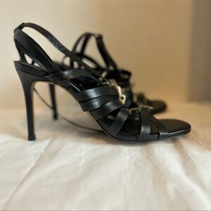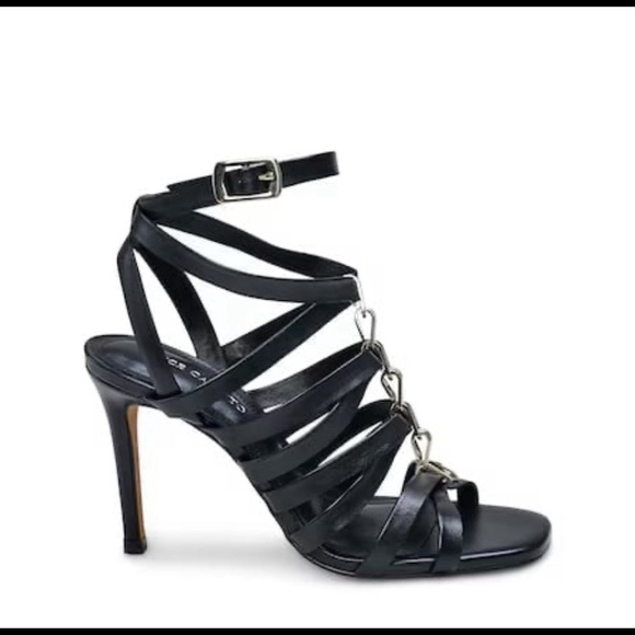 Soft square toe; crisscross vamp straps with metal chain detail; stiletto heel