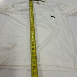 Add a touch of wild style to your comfy wardrobe with this white Victoria’s Secret PINK long sleeve pocket tee. Features a classic embroidered black dog logo on the front pocket and an eye-catching leopard print dog and laurel wreath graphic on the back. The soft cotton fabric and relaxed fit make it a perfect everyday essential.