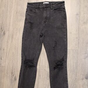 Cello black high-rise skinny jeans with just the right amount of edge. Features a soft stretch fit with distressed knees and faded wash detail for that worn-in look. Easy to pair with anything from oversized sweaters to crop tops and boots.