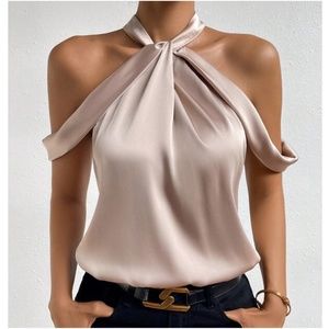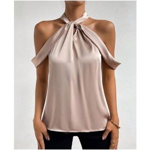 038 Luxe Cold Shoulder Keyhole Back Satin Top