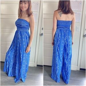 039 Boho Blue Paisley print Smocked Wide Leg Jumpsuit
