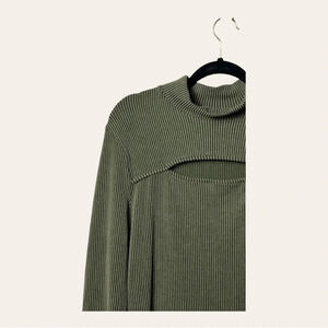 DETAILS: RIBBED MATERIAL; TURTLE NECK; PEEKABOO KEYHOLE ON TOP OF DRESS IN FRONT; LONG SLEEVES; KNEE LENGTH