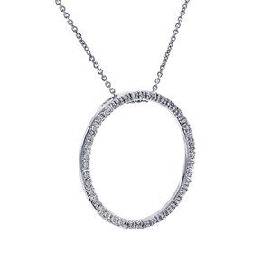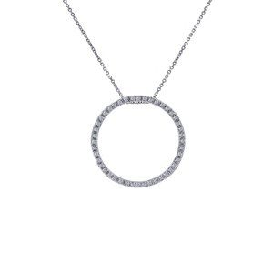 Perfect for your unique true love, this diamond eternity pendant crafted in 14K white gold and contains 0.45 carat (total carat diamond) of round brilliant diamonds, color/clarity is H-I/I1, in a prong setting. Pendant comes with 16" 14K white gold chain, secure with a lobster claw clasp and weighs 5.2 grams. Diameter is 29.8 mm, height is 5.1 mm. Great present, the beautiful pendant can be worn at all occasions.