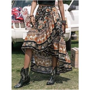047 Bohemian Floral Paisley Print Ruffle Maxi Skirt