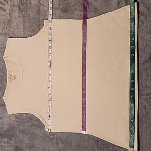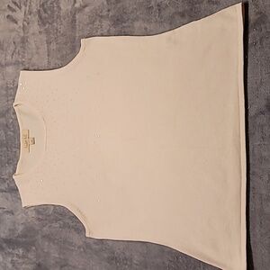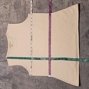 This beautiful, understated, slightly sparkled sweater vest is a light off-white color. Unless otherwise stated, all of my measurements are taken without manipulating the fabric and with the garment lying flat.