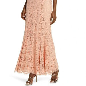 DETAILS: V NECKLINE; SPAGHETTI STRAPS ADJUSTABLE; MERMAID SHAPE TO DRESS; PEACH COLOR WITH SILVER METALLIC THREADS RUNNING THROUGH THE CUT OUT FLORAL DESIGN; ZIPPER AND EYELET CLOSURE ON BACK