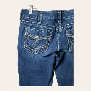 0499W. SILVER DENIM FLUID JEANS SIZEโ 30 DARK WASH BOOTCUT MID SLIM SUKI STYLE