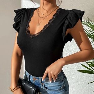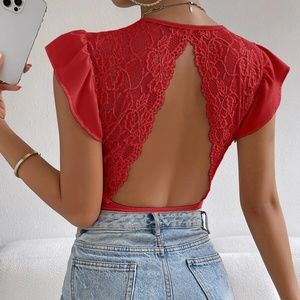 05 Boho Floral Lace Ruffle Sleeve Open Back Bodysuit