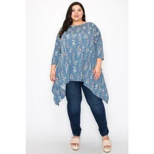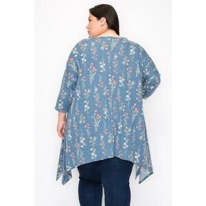051 Curvy Lovey Flower Print Side Drape Tunic Top in Blue
