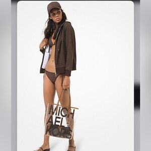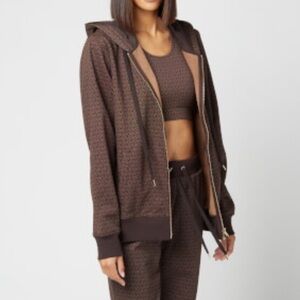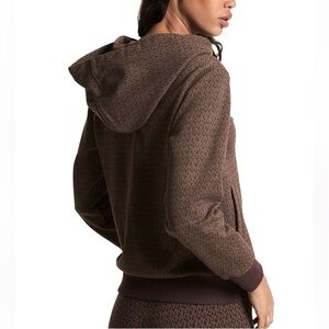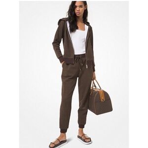Michael Kors Logo Print Logo Organic Cotton Blend Zip-Up Fleece Set in excellent condition, Jogger and zip-up hoodie set in chocolate brown. All-over monogram logo print. Both pieces size medium. 100% cotton terry. Sweatshirt retails at $150, joggers retail at $150$. Brown and beige sweatshirt with a drawstring hood from Michael Michael Kors. Crafted from organic cotton and enriched by the MK' monogram, this hoodie fastens via a zip and features two frontal slip pockets and a ribbed bottom hem and cuffs. Equal parts sporty and chic, this hoodie is crafted from an organic cotton blend with recycled fibers and features our iconic initials for a signature twist. Its relaxed fit ensures easy layering, while its zip fastening adds a functional finish. Team it with the matching joggers for the perfect travel ensemble.