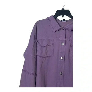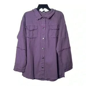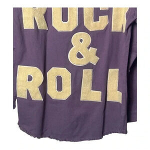 DETAILS: SILVER HARDWARE; BUTTON UP IN FRONT WITH RAISED LETTER JACKET LETTERS SAYING “ROCK AND ROLL”; POCKETS ON FRONT CHEST; BUTTON CUFF SLEEVES; LONG SLEEVES; FRAYED HEMS; COLLARED; JEAN MATERIAL; COTTON; OVERSIZED; MID WEIGHT