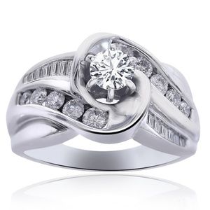 This stunning diamond engagement ring in 14K White Gold is perfectly set with a sparkling 0.25 carat Round shape center diamond with a color/clarity of F / I1 in a prong setting. Elegantly framing the center stone is a Round and Baguette cut diamonds. The mounting has channel set baguette and round cut diamonds all with precisely matched white F/G color and SI clarity with a total weight of 0.45 carat. Engagement ring weighs 7.8 grams, size 6.00. Free re sizing.
