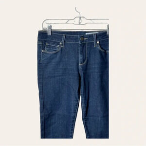 0706. PAIGE PEG SKINNY JEANS DARK WASH IN COLOR RAW HEM SIZE SEE MEASUREMENTS