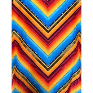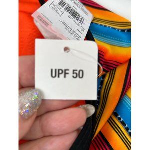 0707A- Joe Boxer girls’ one piece swimsuit, size 6X, 83% polyester, 17% spandex Multicolored: orange, turquoise blue, pink, yellow, with black spaghetti straps and piping trim. Southwest Print, Colorful, 21 inches long, 10 inches across armpits, 10.5 inches across waist, 10.75 inches across hips, for height: 48.5 inches, weight: 47 to 53 pounds. Stretches. Wash inside out, machine washable, cold, gentle cycle separately, remove promptly after wash and dry. No bleach, line dry. No iron. Juvi girls; new with tags.