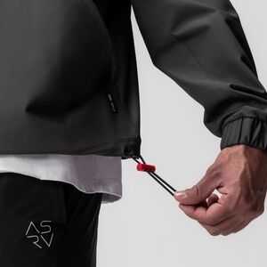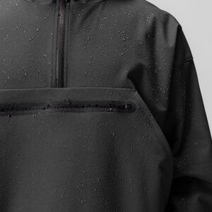 Anorak style jacket constructed from a water-resistant stretch material for transitional climates.