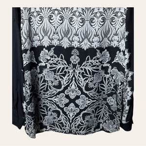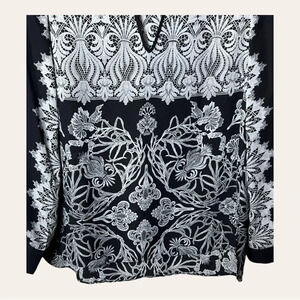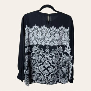 0755. BCBGMAXAZRIA LONG SLEEVE BLOUSE SIZE SMALL BLACK AND WHITE IN COLOR FLORAL