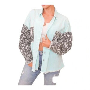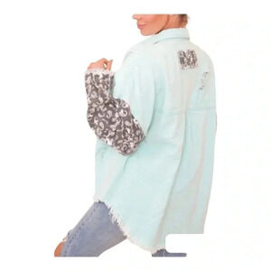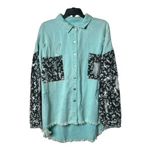 DETAILS: PAISLEY PRINT; FACTORY DISTRESSED THROUGH OUT JACKET; FRAYED HEMS; FULL BUTTON UP; HIGH LOW BOTTOM FRAYED HEMS; OVERSIZED; COLLARED; DENIM; MID WEIGHT