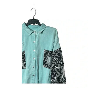 0787. POL PAISLEY PRINT DISTRESSED DENIM JEAN JACKET SIZE LARGE AQUA/NAVY BLUE