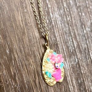 Celluloid flower basket with an aurora borealis rhinestone - set on a gold tone pendant