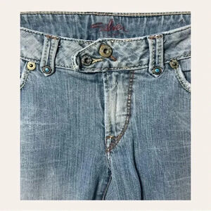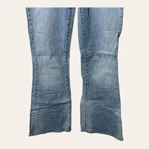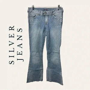 0825. SILVER JEANS DENIM JEANS FLARE LEG SIZE 27 LIGHT WASH DENIM IN COLOR