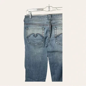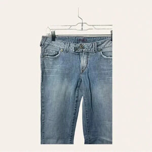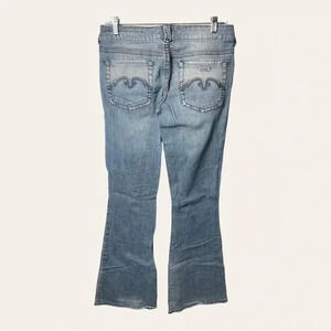 DETAILS: UNIUE BOTTOM ON FLY BUTTON/ZIPPER FLY; 5 POCKET DESIGN; FLARE LEGS; LOW RISE; LIGHT WASH DENIM