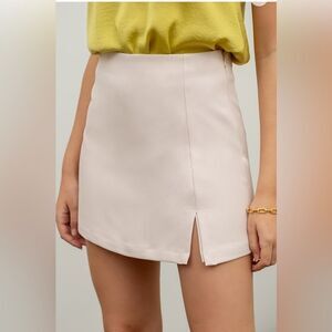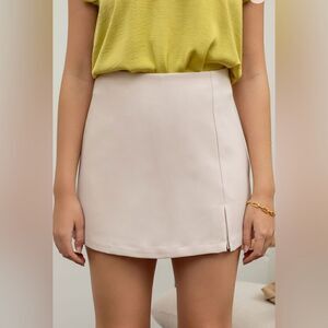 Invisible side zipper, hook and eye closure, side slit, mini skort in oatmeal color.