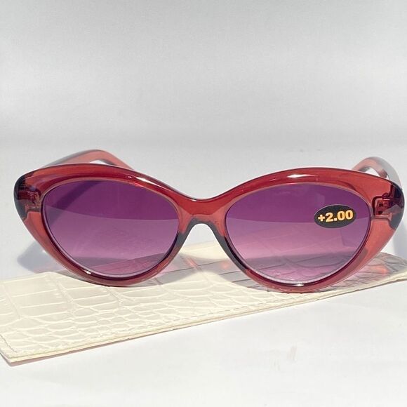 Looking for stylish and functional reading sunglasses that will make you stand out from the crowd? Look no further than these beautiful Clear Cranberry Sweetheart Frames with Purple Lenses, perfect for anyone who needs a little extra help reading small print in bright sunlight. These reading sunglasses are brand new with tags, and feature a comfortable and lightweight design that will keep you looking and feeling great all day long. With a magnification strength of 2.00 they're perfect for anyone who needs a little extra help seeing small print, while the purple lenses will help protect your eyes from the sun's harmful rays. Whether you're lounging on the beach, reading by the pool, or just running errands around town, these stylish and functional reading sunglasses are the perfect accessory for anyone who wants to look great and see clearly.