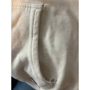 This super cute pull-over hoodie is in a soft cream color with a peace sign, daisies and O'Neill written on front and a Huge peace sign with daisies, butterfly and mushrooms on the back. Beautifully worn in. Holes at 3 corners of front pocket and very faint lightening in two spots on the front. Please refer to photos